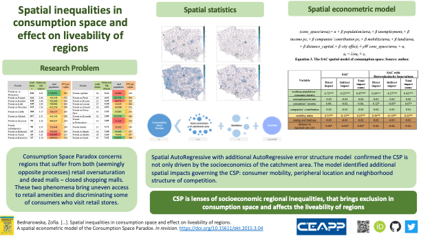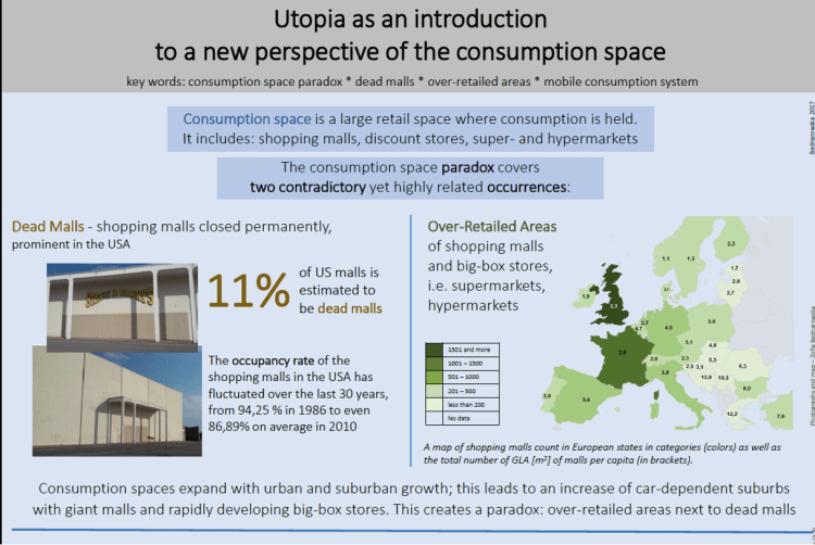Consumption Space Paradox – overretailed areas and dead mall within close proximity. This concept was based on thorough and interdisciplinary empirical research and helped me identify new causes of spatial exclusion, peripheral locations, consumers behavior and mobilities justice.