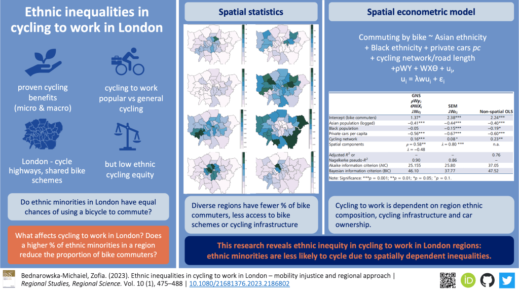 - Bednarowska-Michaiel, Z. (2023). Ethnic inequalities in cycling to work in London – mobilities injustice and regional approach. 10(1), 475–488. Regional Studies, Regional Science https://doi.org/10.1080/21681376.2023.2186802